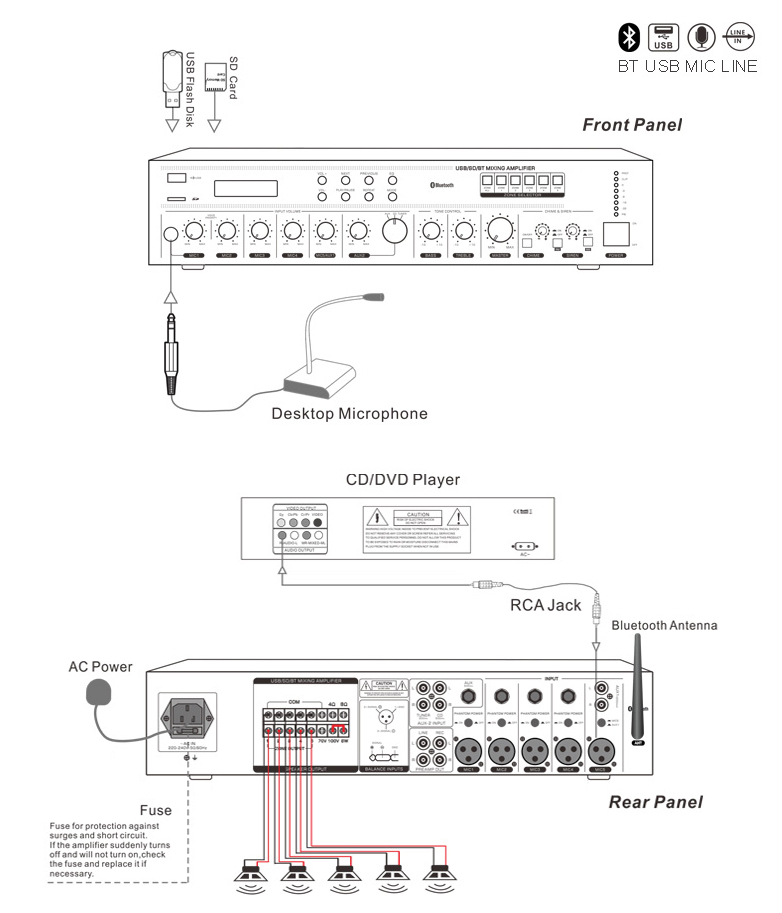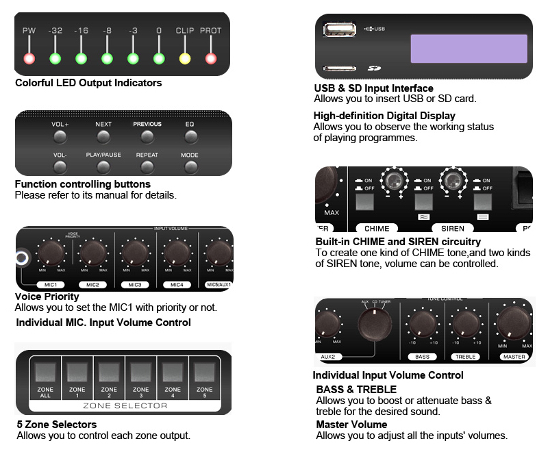 This series 5 zone 100V PA amplifiers are integrated with with bluetooth and USB/SD audio player, 5 balanced MIC (MIC1 has another port of 6.35mm socket on front panel) input, 2 unbalanced AUX input, each with individual volume control.