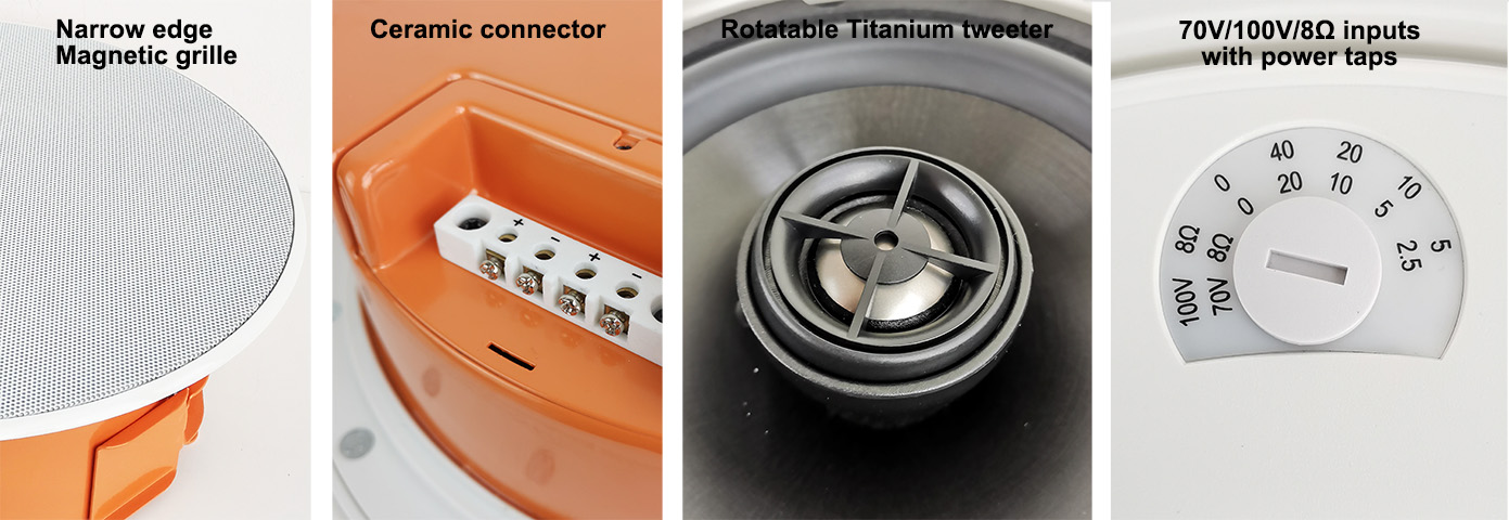 This series indoor ceiling speakers are coming with 4", 5" or 6.5" Graphite cone material woofer speaker driver and 0.75" or 1" silk or Titanium dome tweeter, with 70V/100V transformer.