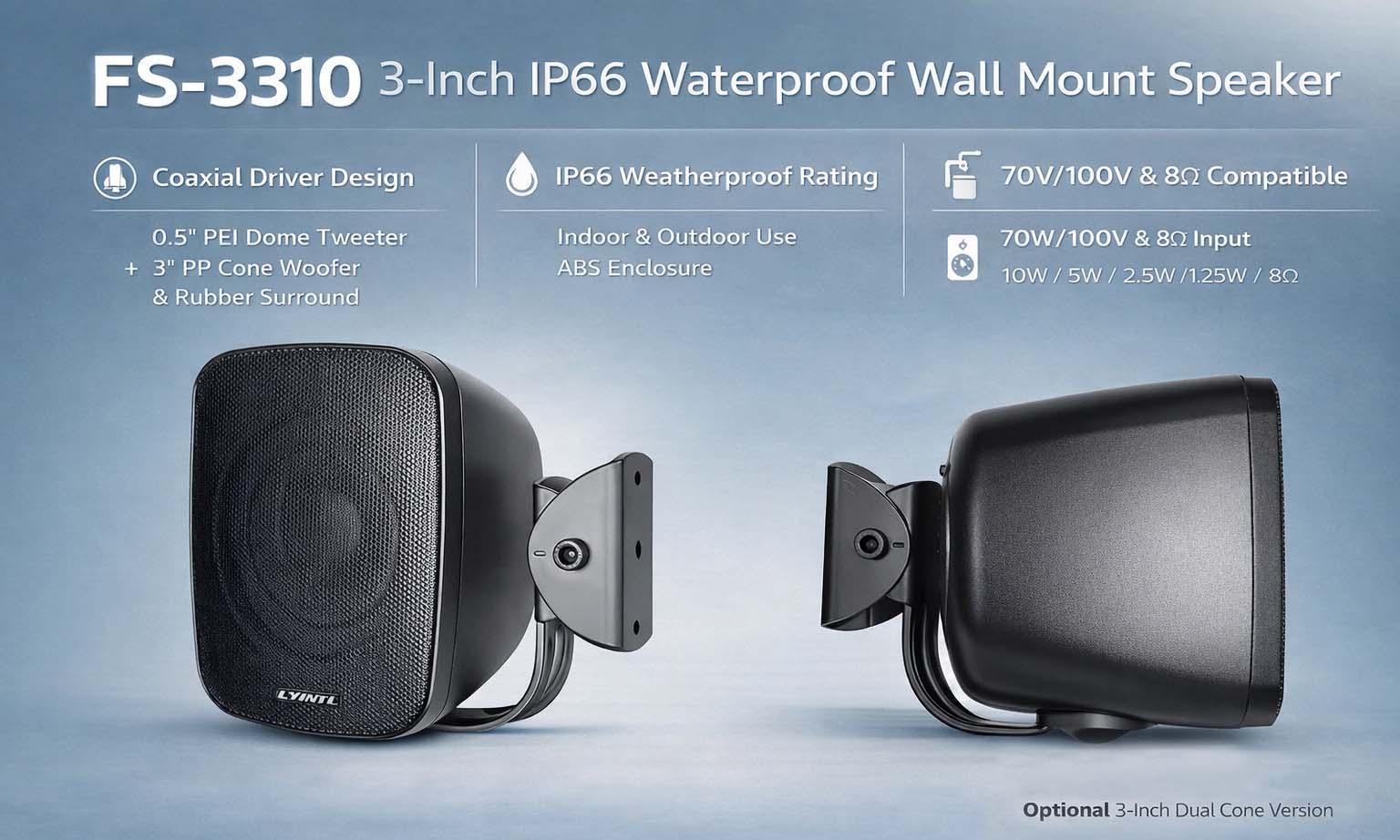 The FS-3310 3-inch IP66 waterproof wall mount speaker is a compact yet powerful commercial audio speaker designed for both indoor and outdoor background music systems. Featuring a coaxial driver design, durable ABS enclosure, and IP66 waterproof protection, this speaker delivers clear and reliable audio performance in various commercial environments.