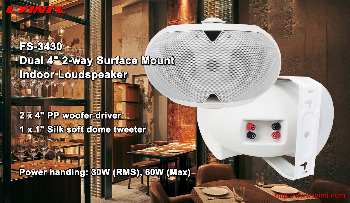 FS-3430 indoor wall mount speakers are coming with very elegant and sleek housing design, build-in 2pcs 4" low frequency woofer speaker driver and 1pc 1" high frequency silk soft dome tweeter.