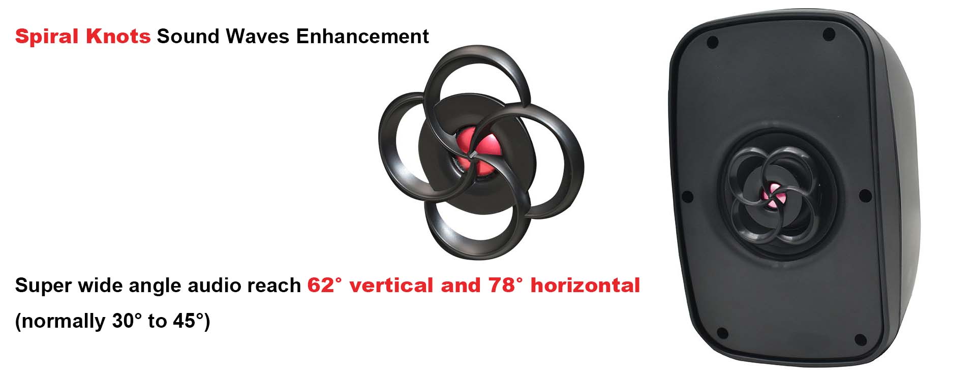This unique Spiral Knots Sound Waves Enhancement design not only looks good, when work together with the special wide arc on the front housing, it helps create a super wide angle of 62° vertical and 78° horizontal audio reach (normally 30° to 45°).