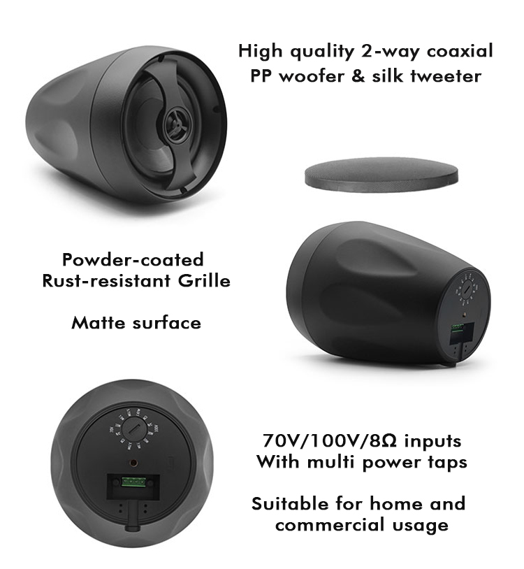 Combination design and great sound wall mounted speaker, with the high-class woofer, bring users outstanding sound quality. High temperature resistance and IP66 weatherproof, can be used in indoor and outdoor. With the special brackets, the speaker can be easily mounted under various angles in corners or on surfaces such as wall and ceiling.