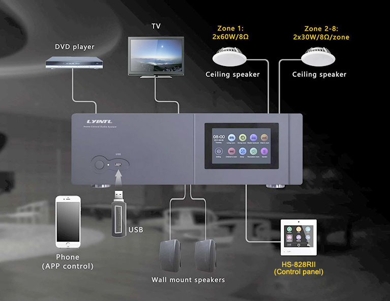 This system is integrated with MP3 player, network music play, network radio, partition output, timer and mixer amplifier, etc,.