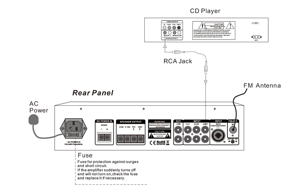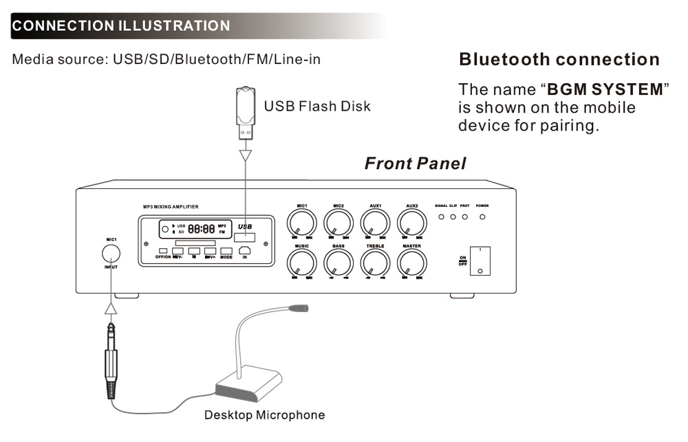 This compact mixing amplifier is designed as convenient solution for small PA installations with USB player, Bluetooth and FM tuner receiver in a compact housing, and this amplifier features 2 unbalanced microphone input and 2 AUX inputs, moreover the MIC1 has "VOICE PRIORITY" over the other inputs except for the alarm input, moreover a group of line level output is available for adding additional amplifier.